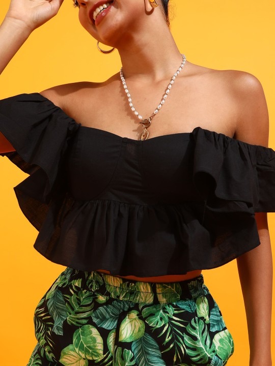 It’s one of the prettiest crop tops to wear with jeans, especially when paired with high-rise jeggings or skinny denim. The off-shoulder cut draws attention to your collarbones, while the ruffles add a playful elegance.
