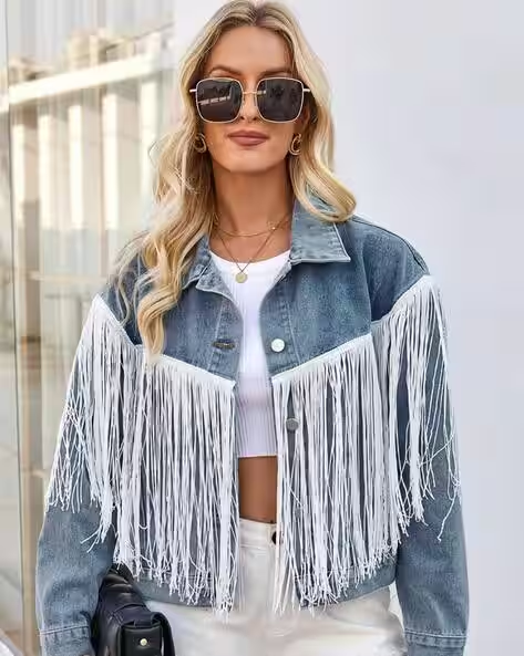 Why it’s trending: The fringe detail adds instant movement and drama to your outfit—making it ideal for wind-blown Insta photos and dance-filled nights. Whether you’re going for western vibes or retro rockstar chic, this jacket turns basic into bold in seconds.