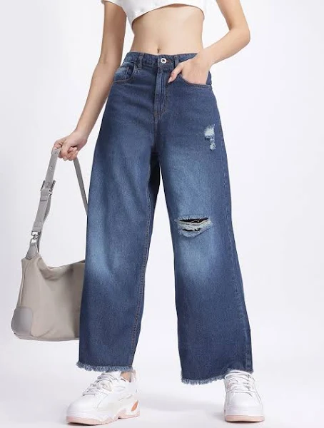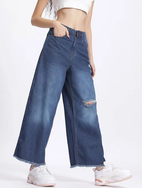 Explore Women’s Blue Baggy Cut-Out Wide-Leg Jeans featuring frayed hems and edgy streetwear design. Discover how to style them for urban, Y2K, and minimalist looks.